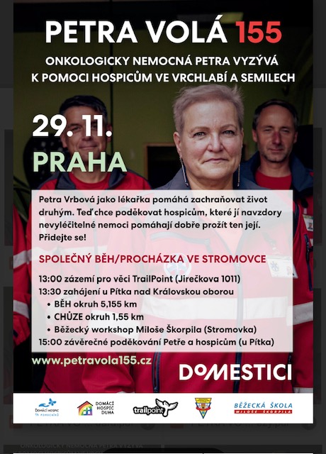 Závěrečný happening PETRA VOLÁ 155 symbolicky uzavírá listopadovou dárcovskou a sportovní výzvu, kterou odstartovala lékařka záchranné služby Petra Vrbová. Petra, která sama prochází těžkou nemocí, chtěla svou výzvou vrátit sílu těm, kteří jí ji sami dodali – pracovníkům paliativní péče a domácím hospicům.